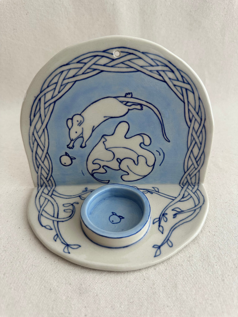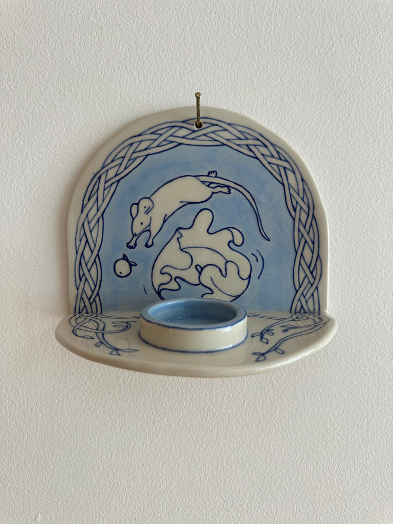 Bougeoir mural en céramique fait à la main, illustrant une souris sautant au-dessus d’une feuille pour attraper une baie. C'est l'opportunité d'avoir un objet adorablement imparfait et original pour apporter un peu de fantaisie à son quotidien hivernal.