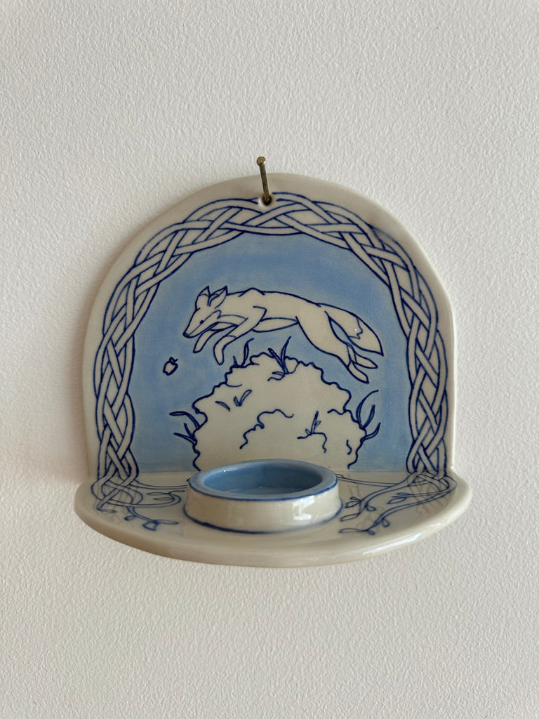 Bougeoir mural en céramique fait à la main, illustrant un renard sautant au-dessus d’un buisson pour attraper une pomme. C'est l'opportunité d'avoir un objet adorablement imparfait et original pour apporter un peu de fantaisie à son quotidien hivernal.