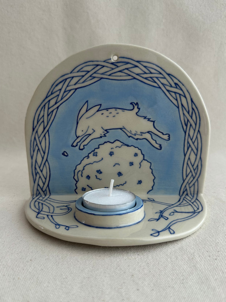 Bougeoir mural en céramique fait à la main, illustrant un lapin sautant au-dessus d’un buisson pour attraper un papillon. C'est l'opportunité d'avoir un objet adorablement imparfait et original pour apporter un peu de fantaisie à son quotidien hivernal.