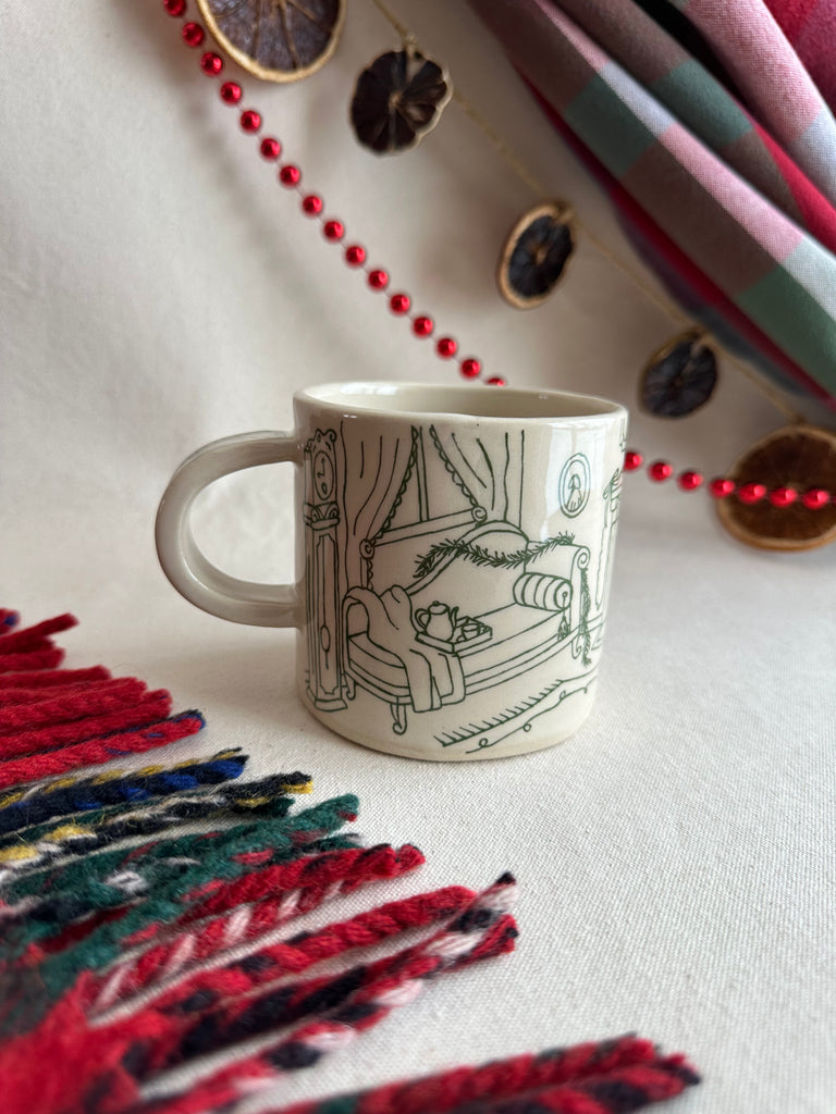 Handmade ceramic mug depicting a fancy and festive living room. It is the opportunity to have an original and adorably imperfect object to make the wintry days a little more special.