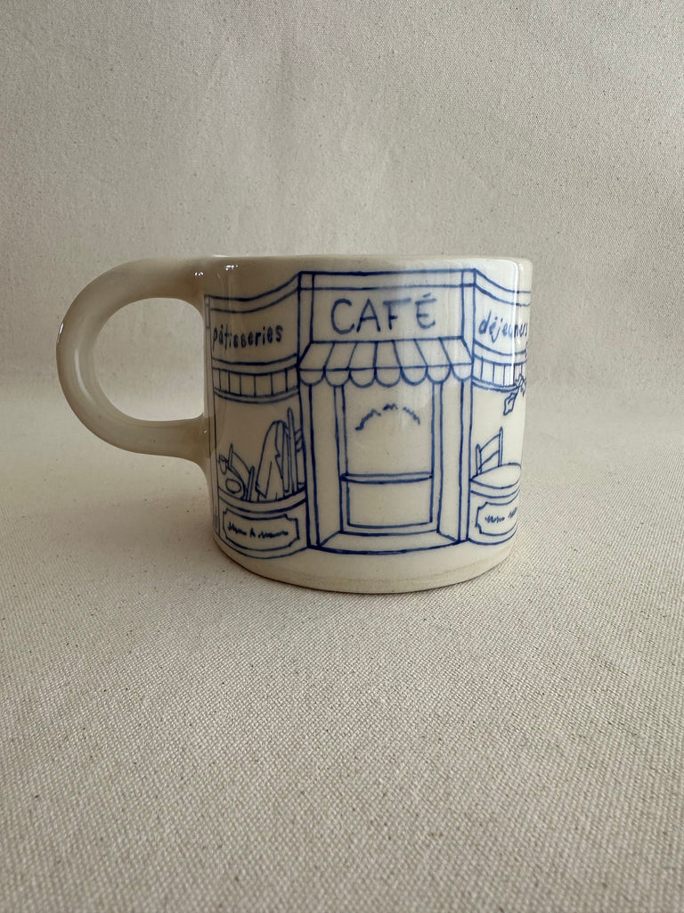 Tasse en céramique faite à la main. Puisque chaque tasse est peinte à la main, certains détails des éléments illustrés peuvent varier légèrement d’une tasse à l’autre.