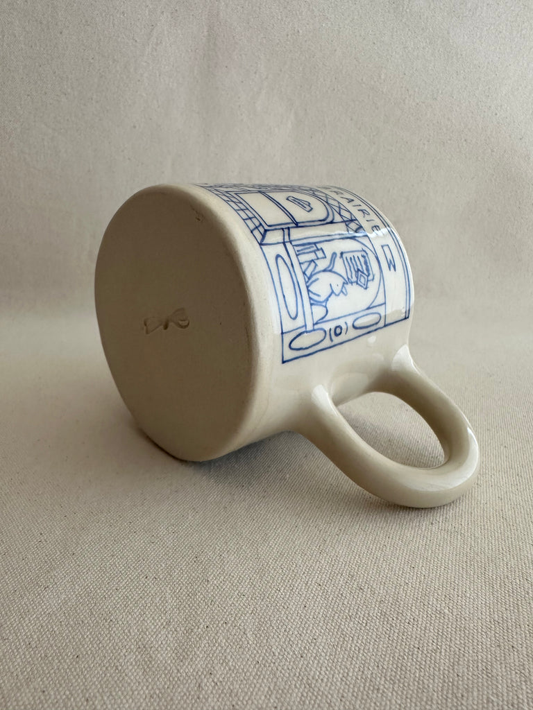 Handmade ceramic mug. Since every mug is hand painted by yours truly, some details in the different elements of the illustration can vary a little from one mug to the other.